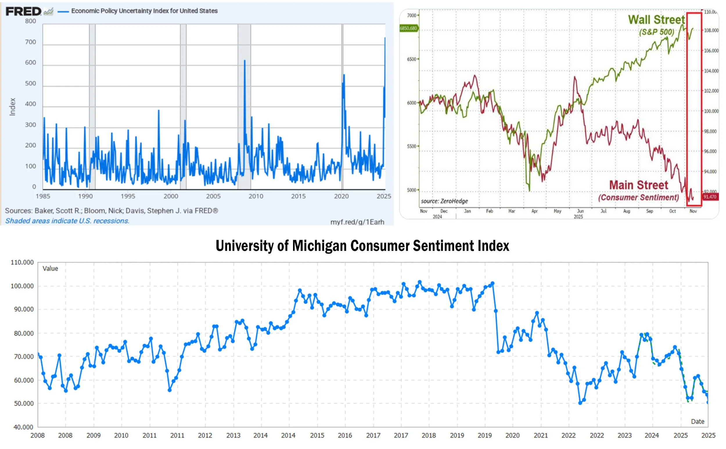 After that revelation, I started connecting the dots. Digging deeper, it became clear that not only is uncertainty off the rails, but consumer confidence is at record low levels. Yet, despite the great uncertainty and low confidence, stock market indexes have been breaking records.